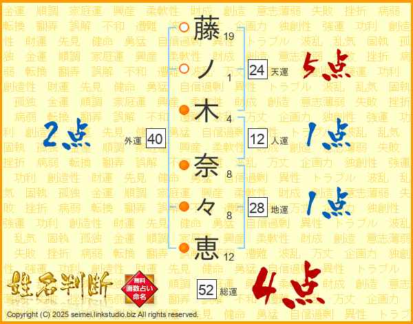 藤(19画)ノ(1画)木(4画) 奈(8画)々(8画)恵(12画)
