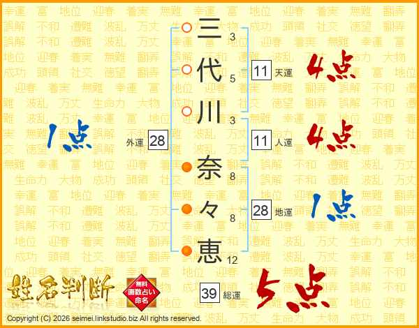 三(3画)代(5画)川(3画) 奈(8画)々(8画)恵(12画)