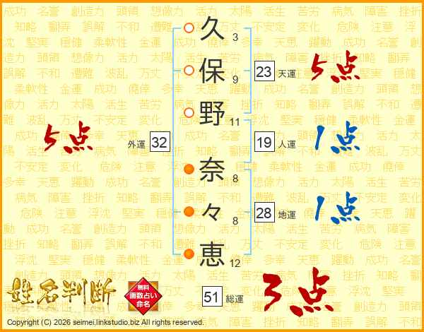久(3画)保(9画)野(11画) 奈(8画)々(8画)恵(12画)