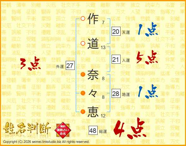 作(7画)道(13画) 奈(8画)々(8画)恵(12画)