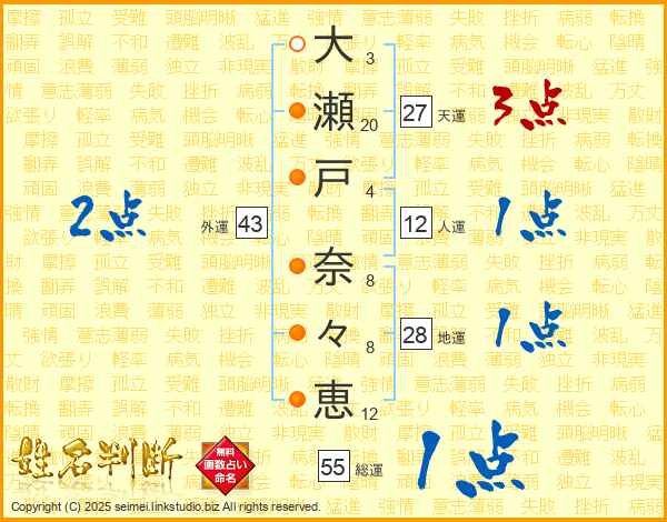 大(3画)瀬(20画)戸(4画) 奈(8画)々(8画)恵(12画)