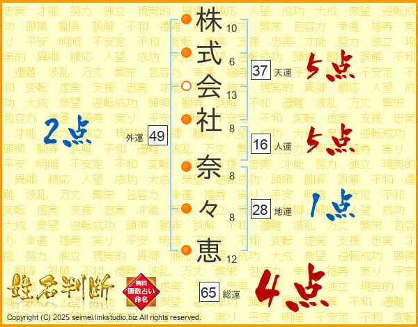 株(10画)式(6画)会(13画)社(8画) 奈(8画)々(8画)恵(12画)