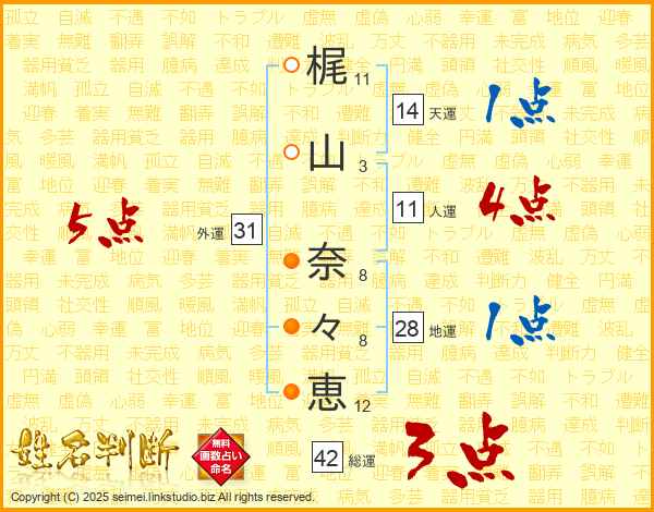 梶(11画)山(3画) 奈(8画)々(8画)恵(12画)