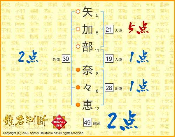 矢(5画)加(5画)部(11画)  奈(8画)々(8画)恵(12画)