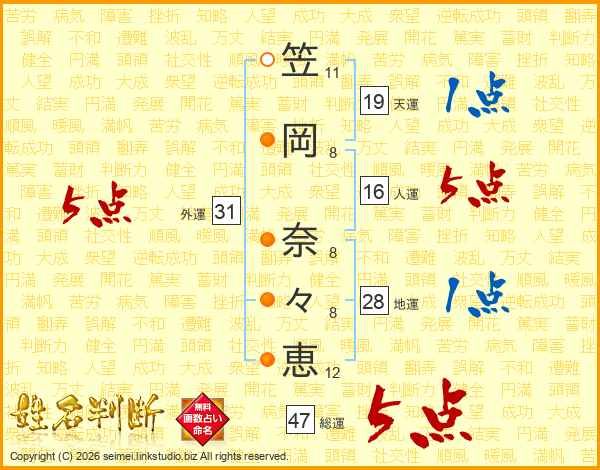 笠(11画)岡(8画) 奈(8画)々(8画)恵(12画)