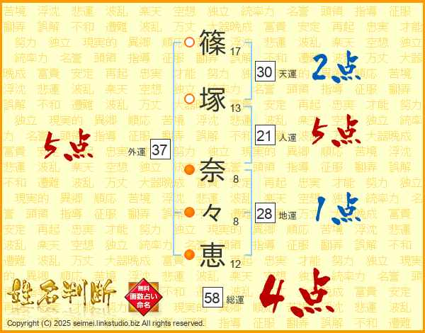 篠(17画)塚(13画) 奈(8画)々(8画)恵(12画)