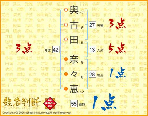 與(17画)古(5画)田(5画) 奈(8画)々(8画)恵(12画)