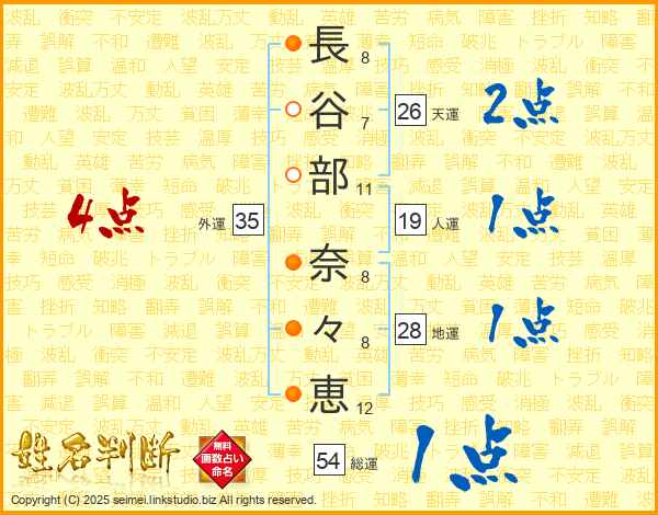 長(8画)谷(7画)部(11画) 奈(8画)々(8画)恵(12画)
