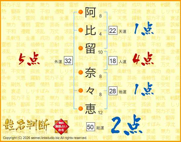 阿(8画)比(4画)留(10画) 奈(8画)々(8画)恵(12画)