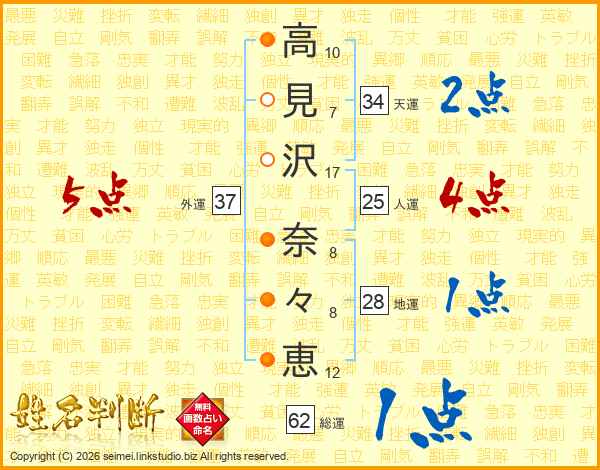 高(10画)見(7画)沢(17画) 奈(8画)々(8画)恵(12画)