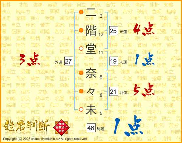 二(2画)階(12画)堂(11画) 奈(8画)々(8画)未(5画)