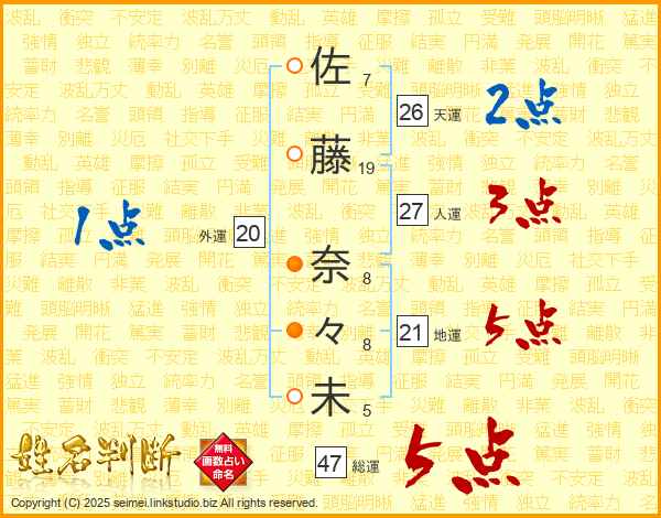 佐藤奈々未さんの総運は47画の5点!