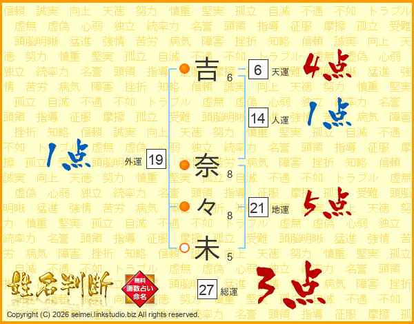 生活面を象徴する運勢です。外部から受ける影響力を表し、結婚運、家庭運や職場、環境への順応性を表します。総運から人運を引いた画数。姓や名が1文字の場合を除く。