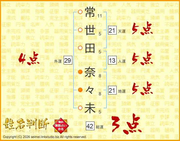 常(11画)世(5画)田(5画) 奈(8画)々(8画)未(5画)