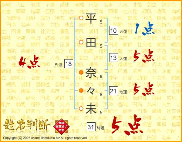 平(5画)田(5画) 奈(8画)々(8画)未(5画)