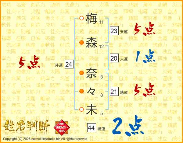 梅(11画)森(12画) 奈(8画)々(8画)未(5画)