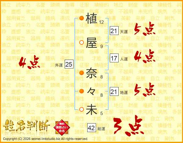 植屋奈々未さんの天運は21画の5点!