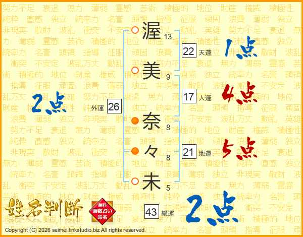 渥(13画)美(9画) 奈(8画)々(8画)未(5画)