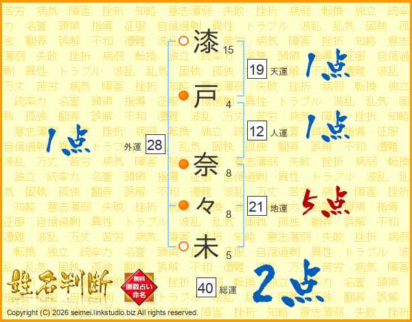 漆(15画)戸(4画) 奈(8画)々(8画)未(5画)
