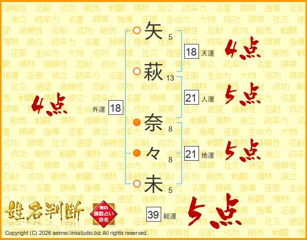 矢(5画)萩(13画) 奈(8画)々(8画)未(5画)