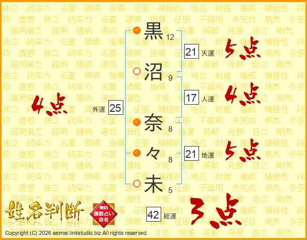 黒沼奈々未さんの地運は21画の5点!