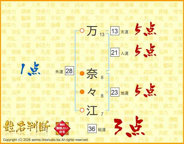 生活面を象徴する運勢です。外部から受ける影響力を表し、結婚運、家庭運や職場、環境への順応性を表します。総運から人運を引いた画数。姓や名が1文字の場合を除く。