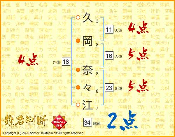久(3画)岡(8画) 奈(8画)々(8画)江(7画)