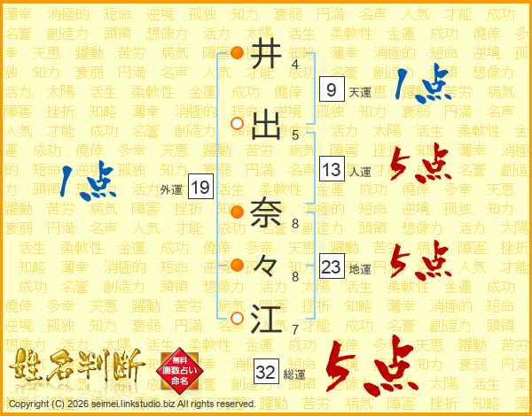 井(4画)出(5画) 奈(8画)々(8画)江(7画)
