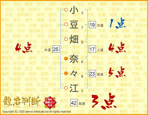 小(3画)豆(7画)畑(9画) 奈(8画)々(8画)江(7画)