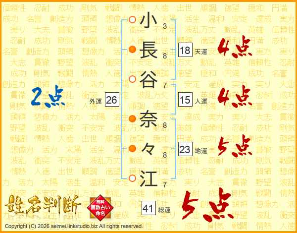 小(3画)長(8画)谷(7画) 奈(8画)々(8画)江(7画)