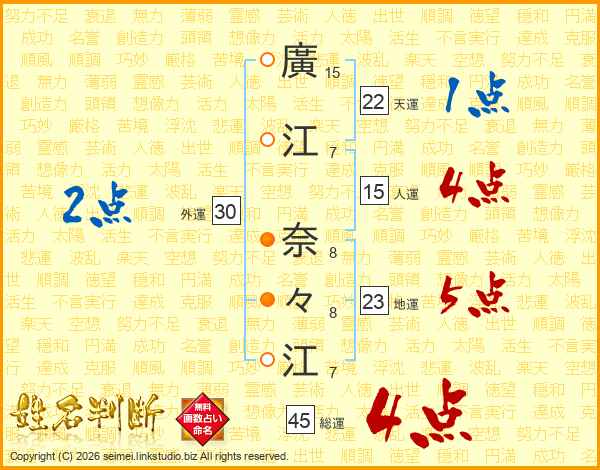 廣(15画)江(7画) 奈(8画)々(8画)江(7画)
