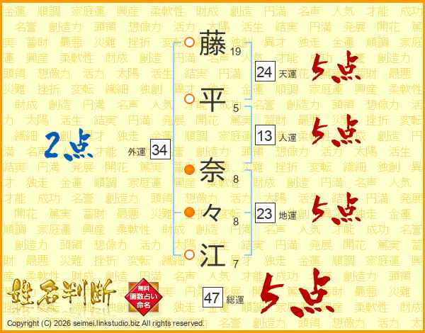 藤(19画)平(5画) 奈(8画)々(8画)江(7画)