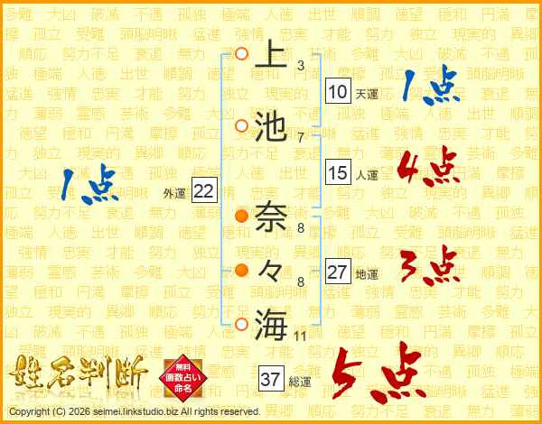 上(3画)池(7画) 奈(8画)々(8画)海(11画)