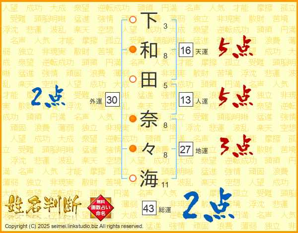 下(3画)和(8画)田(5画) 奈(8画)々(8画)海(11画)