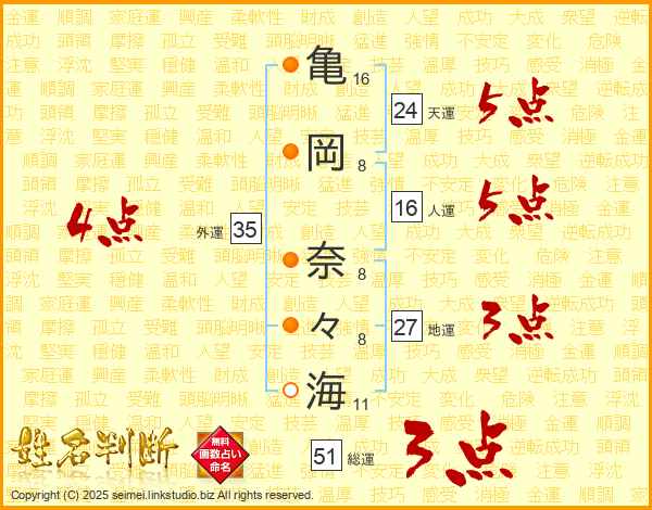 亀(16画)岡(8画) 奈(8画)々(8画)海(11画)