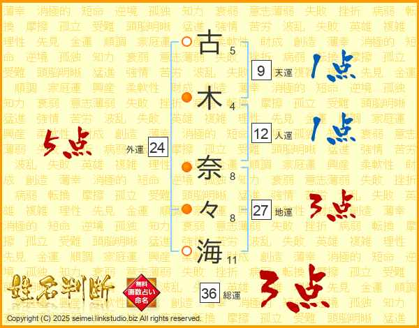 古(5画)木(4画) 奈(8画)々(8画)海(11画)