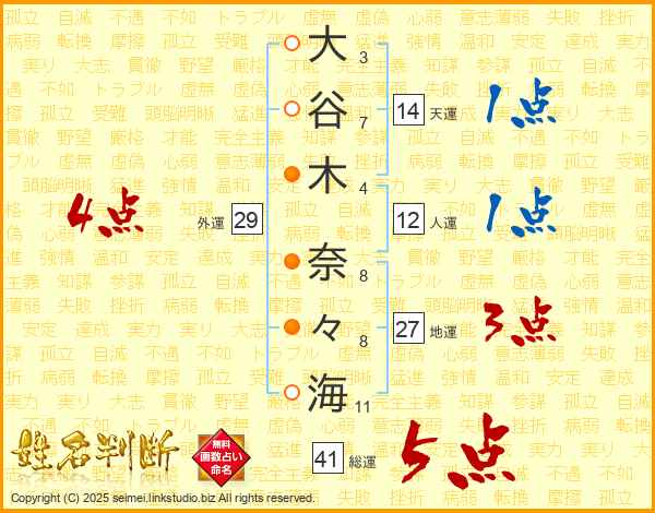 大(3画)谷(7画)木(4画) 奈(8画)々(8画)海(11画)
