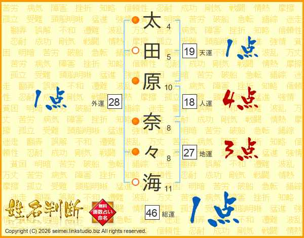 太(4画)田(5画)原(10画) 奈(8画)々(8画)海(11画)