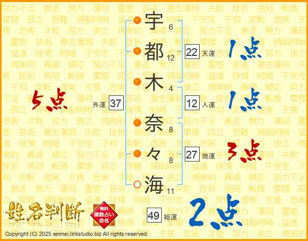 宇(6画)都(12画)木(4画) 奈(8画)々(8画)海(11画)