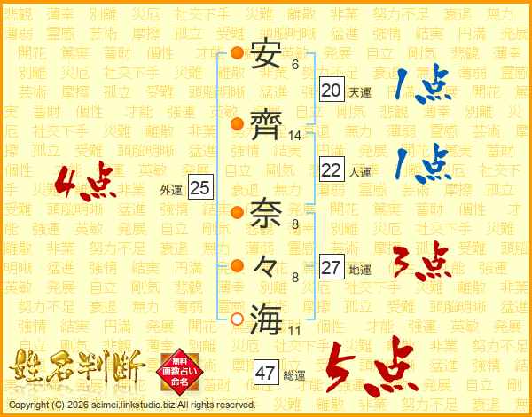 安(6画)齊(14画) 奈(8画)々(8画)海(11画)