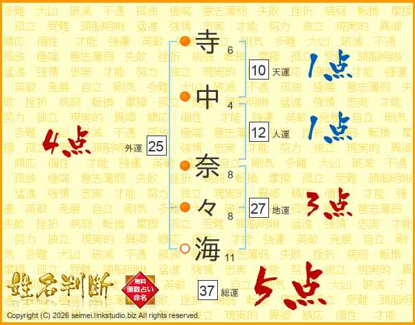 寺(6画)中(4画) 奈(8画)々(8画)海(11画)