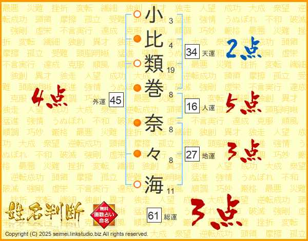 小(3画)比(4画)類(19画)巻(8画) 奈(8画)々(8画)海(11画)