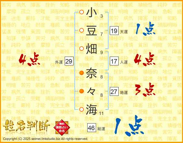 小(3画)豆(7画)畑(9画) 奈(8画)々(8画)海(11画)