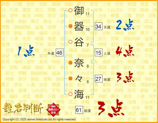 御(11画)器(16画)谷(7画) 奈(8画)々(8画)海(11画)