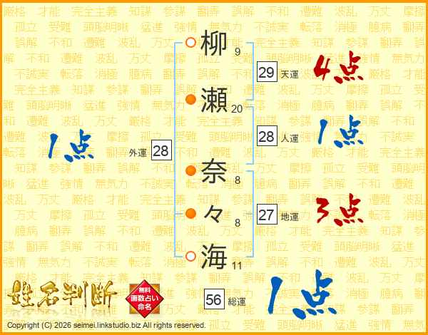 柳(9画)瀬(20画) 奈(8画)々(8画)海(11画)