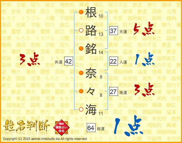 根(10画)路(13画)銘(14画) 奈(8画)々(8画)海(11画)