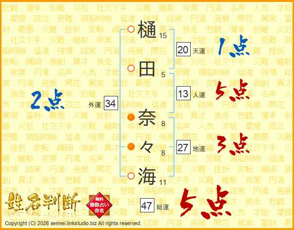 樋(15画)田(5画) 奈(8画)々(8画)海(11画)