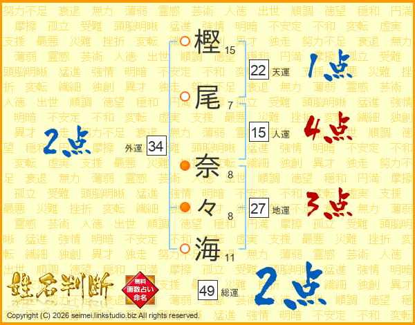 樫(15画)尾(7画) 奈(8画)々(8画)海(11画)