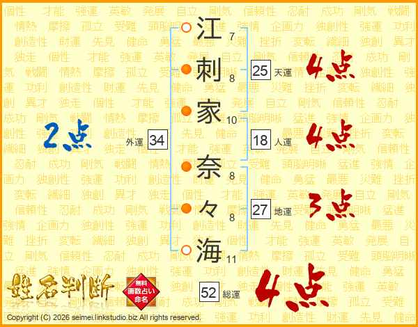 江(7画)刺(8画)家(10画) 奈(8画)々(8画)海(11画)