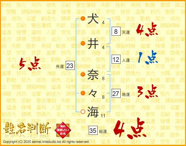 犬(4画)井(4画) 奈(8画)々(8画)海(11画)